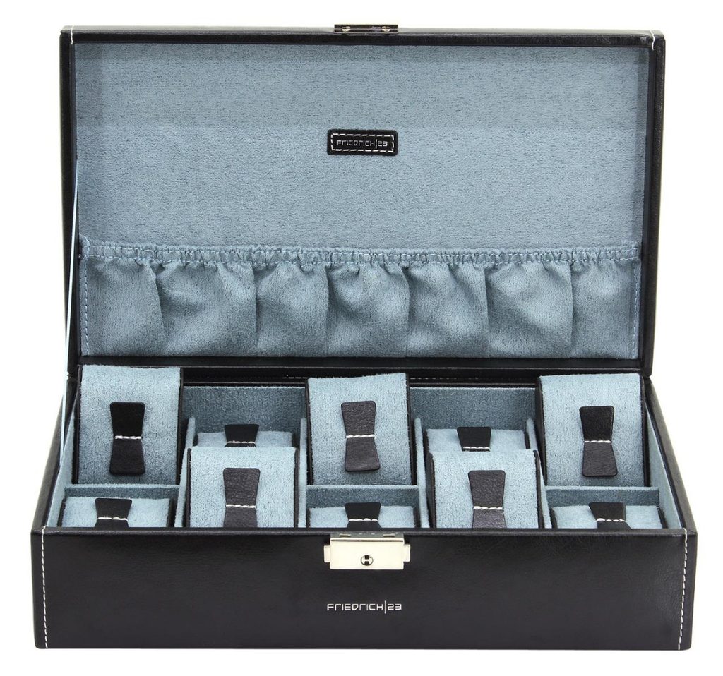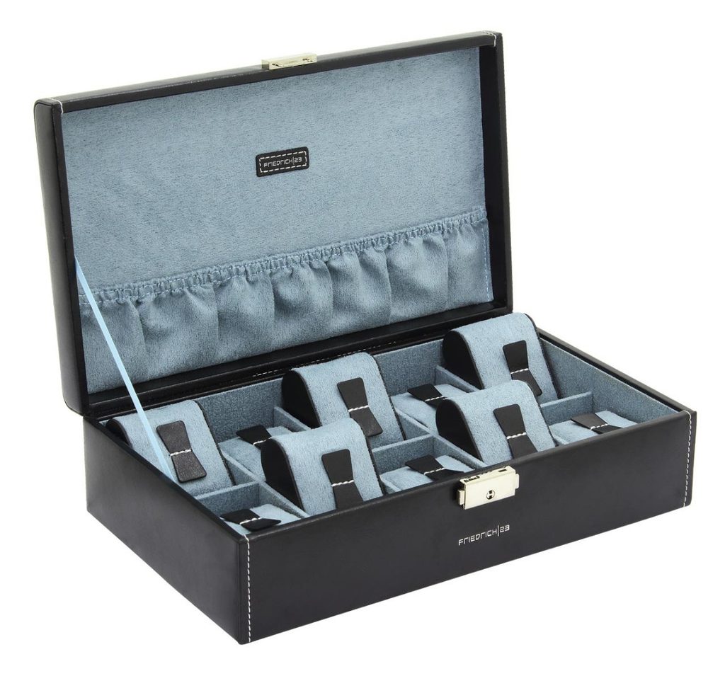 Elegantní box na hodinky Friedrich Lederwaren Bond 20068-2 pro 10 kusů hodinek. Vyrobeno z černého syntetického materiálu se světle modrým, semišovým interiérem.