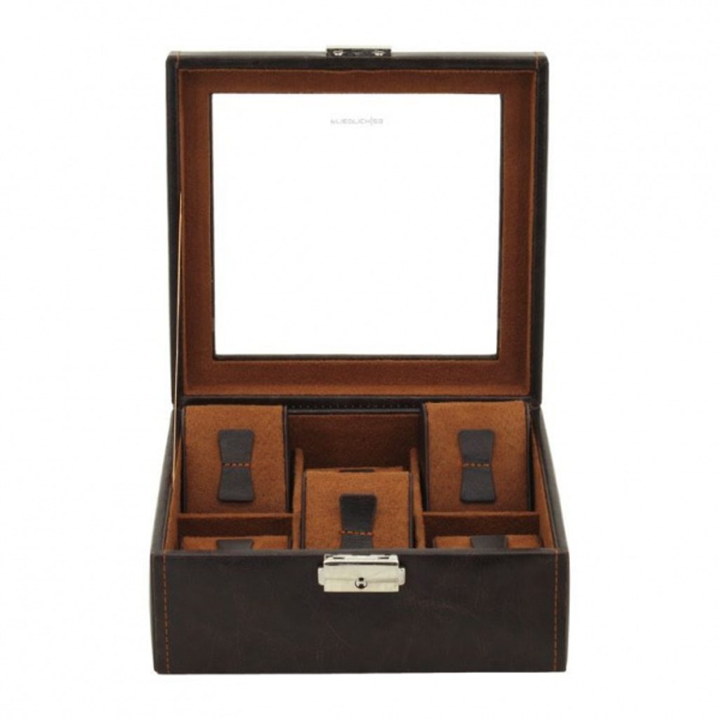 Elegantní box na hodinky Friedrich Lederwaren Bond 20085-3 s průhledným víkem pro 6 kusů hodinek. Vyrobeno z hnědého syntetického materiálu se světle hnědým semišovým interiérem.