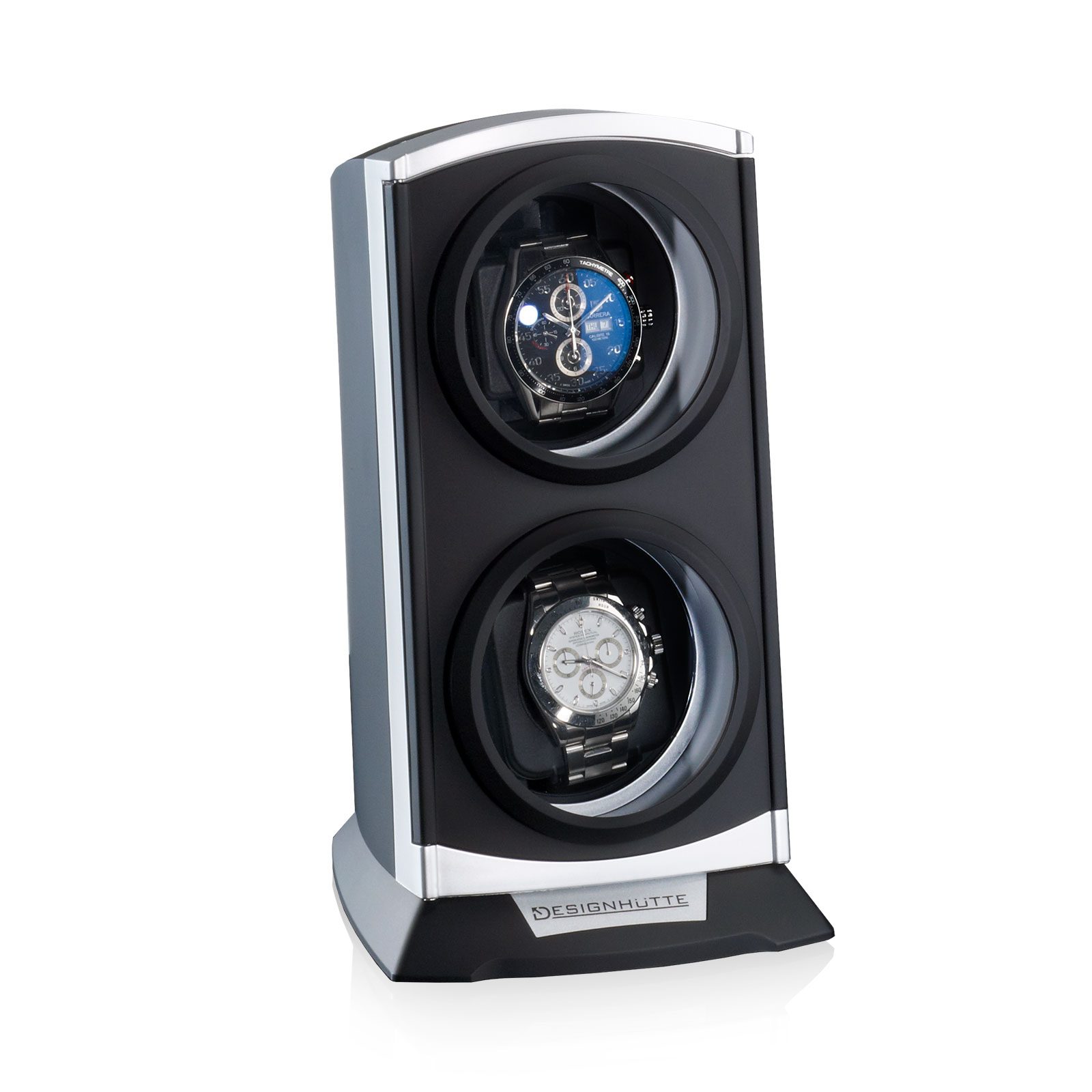Natahovač Designhütte Primus 70005-62 černo-stříbrné barvy, pro 2 kusy mechanických hodinek s automatickým nátahem, který zaujme svým moderním designem. Díky různým režimům otáčení je vhodný téměř pro všechny běžné hodinky s automatickým nátahem. Průhled na hodinky je z plexiskla.