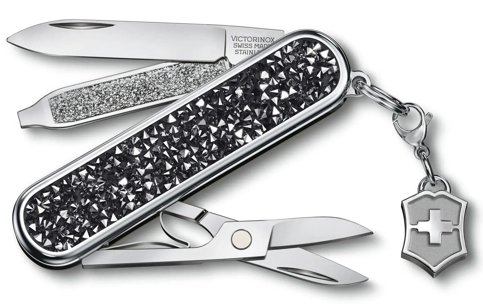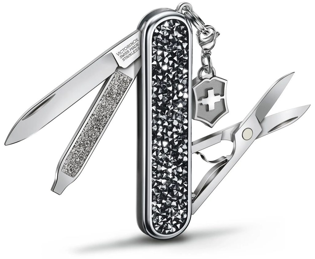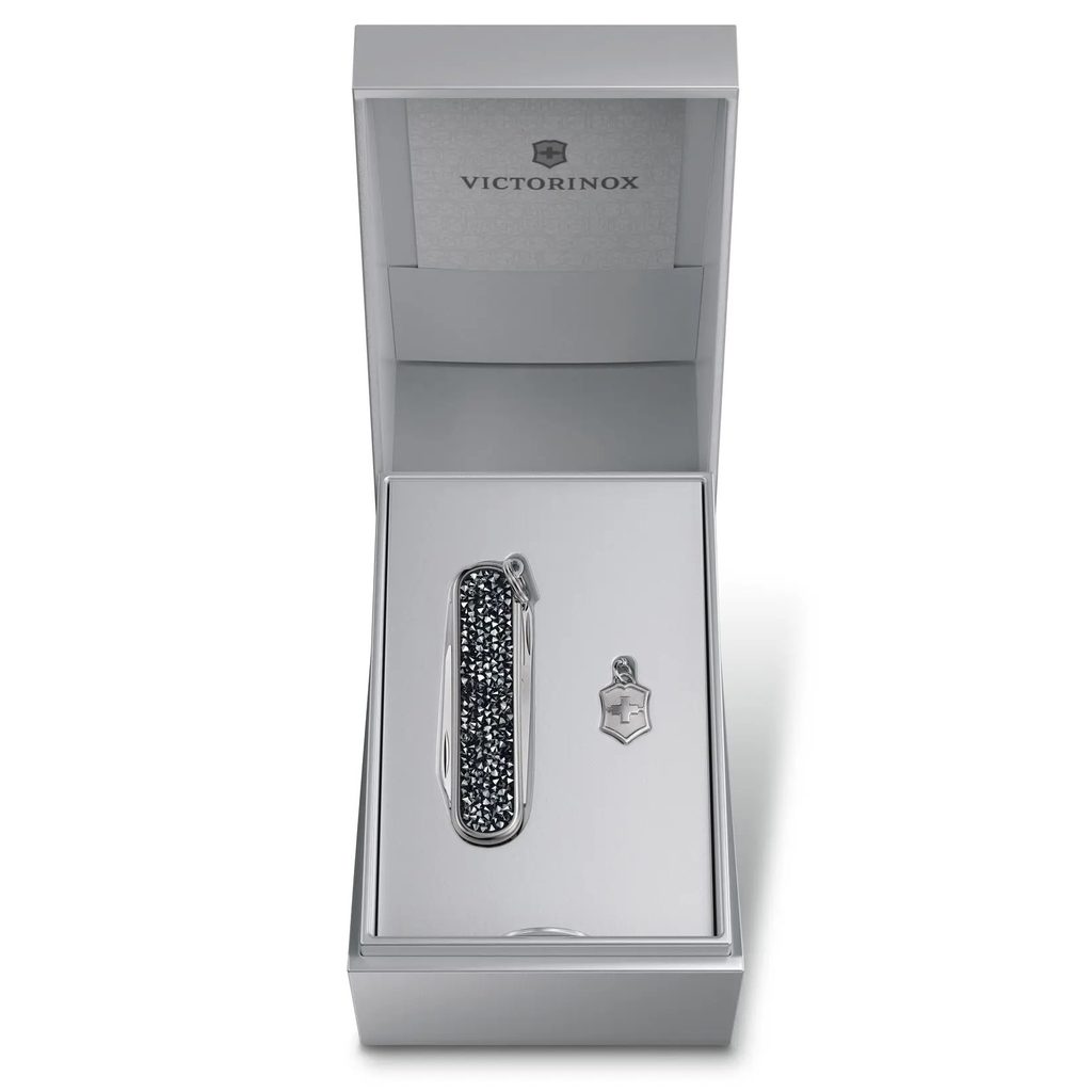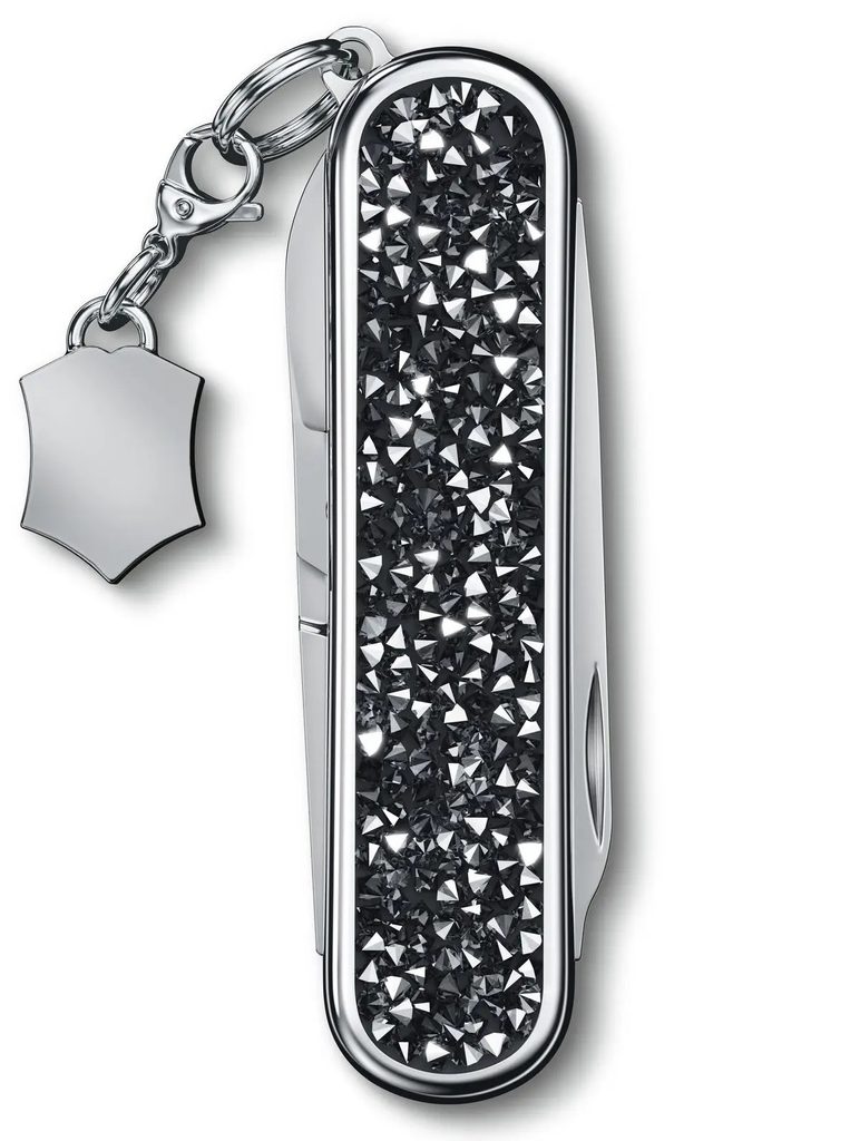 Malý kapesní nůž Victorinox se střenkou ze skleněných černých třpytivých krystalů je elegantním doplňkem, stejně tak i plnohodnotným nástrojem vybaveným 5 funkcemi.