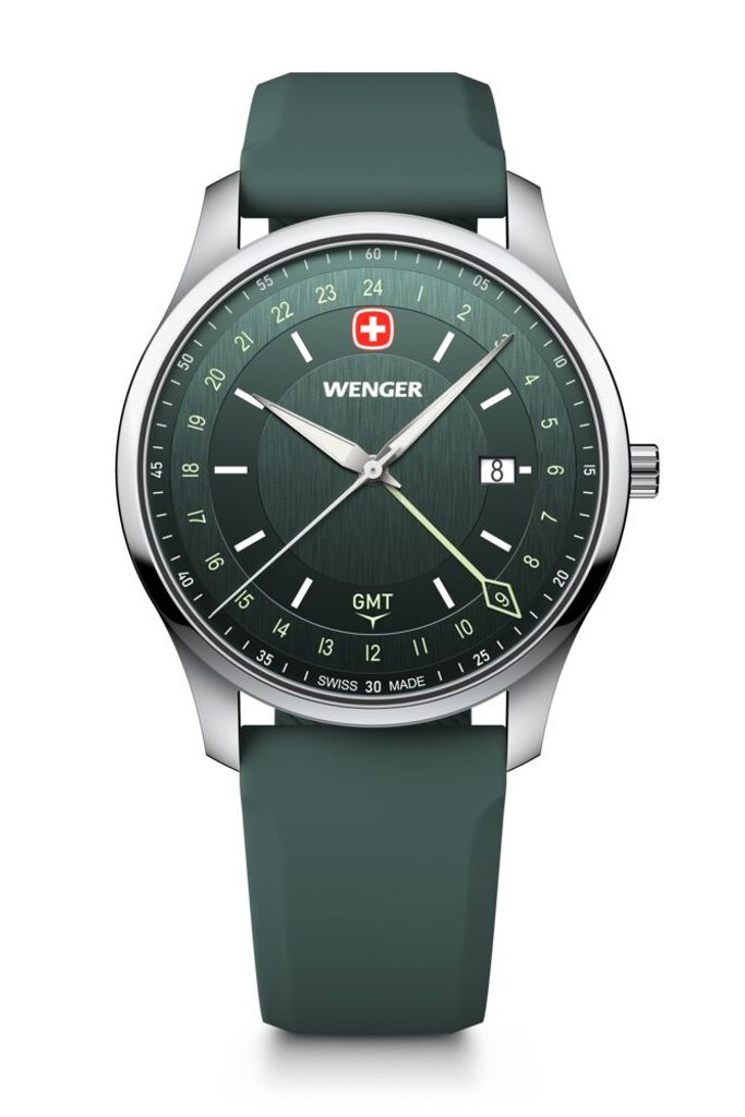 Zcela nová modelová řada City GMT, která v sobě snoubí nadčasový design s moderní funkčností. Model s označením Wenger City GMT 01.1442.101 nese označení Swiss Made, hodinky disponují funkcí GMT, díky níž můžete snadno sledovat více časových pásem, ať už vás cesty zavedou kamkoli. K tomuto účelu slouží nejdelší barevná ručka s kosočtvercovým zakončením.