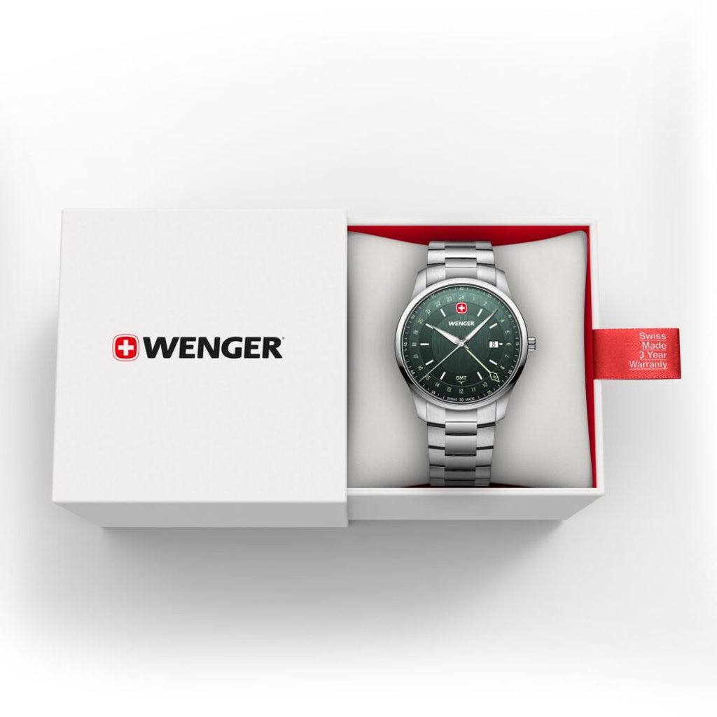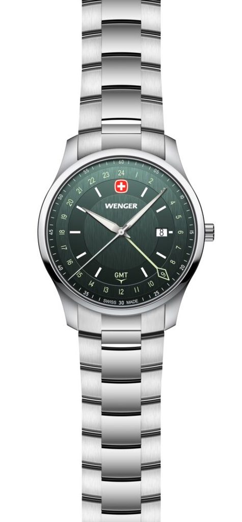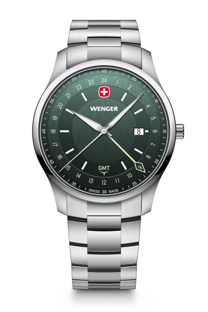 Zcela nová modelová řada City GMT, která v sobě snoubí nadčasový design s moderní funkčností. Model s označením Wenger City GMT 01.1442.107 nese označení Swiss Made, hodinky disponují funkcí GMT, díky níž můžete snadno sledovat více časových pásem, ať už vás cesty zavedou kamkoli. K tomuto účelu slouží nejdelší barevná ručka s kosočtvercovým zakončením.
