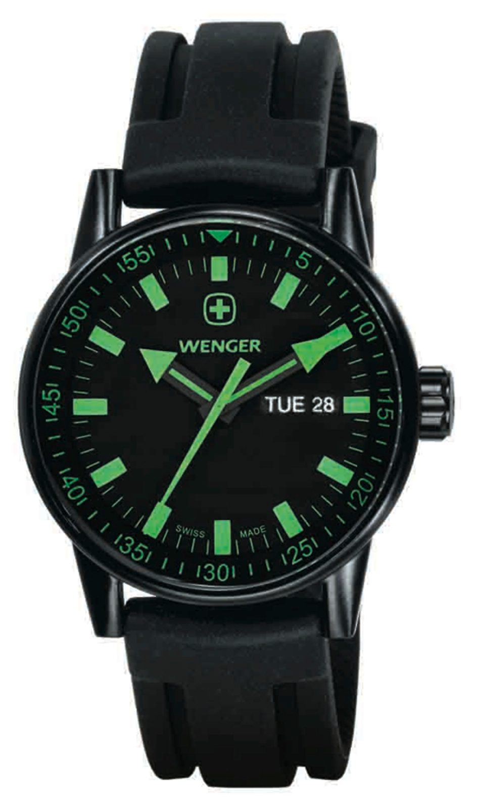 Model Wenger Commando Black 70172 na první pohled zaujme konstrastním provedením ciferníku v černé a zelené barvě. Výrazné luminiscenční ručičky a indexy zajišťují perfekní čitelnost v jakýchkoliv podmínkách. Za zmínku stojí také pouzdro ze švýcarské oceli s odolnou PVD úpravou, minerální sklo se safírovou vrstvou a datumovka ukazující i den v týdnu.