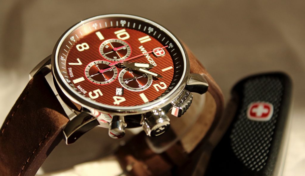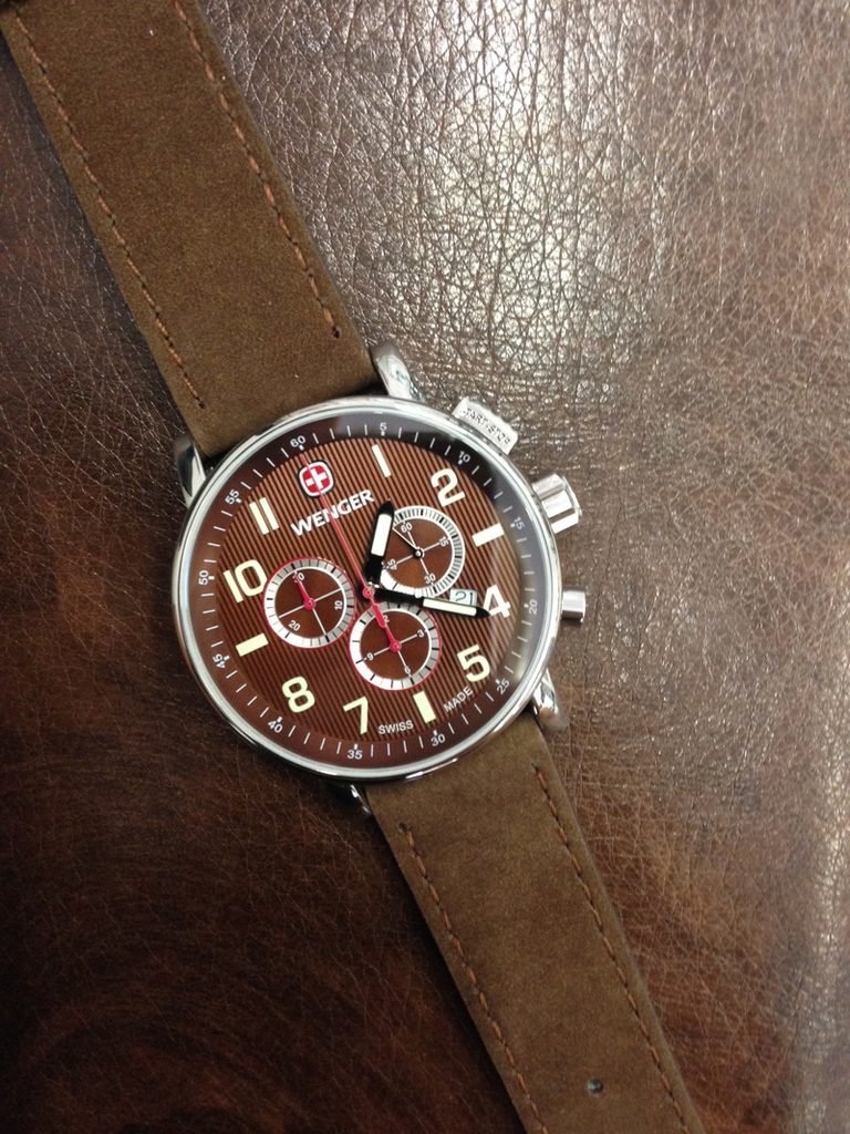 Modelová řada Commando byla pro rok 2014 vylepšena o velmi povedené modely s chronografem. Spojuje je velké leštěné ocelové pouzdro s tlačítky stopek v jeho pravé části. Horní tlačítko má hranatý tvar s nápisem start-stop vycházející z designu klasických stopek pro lepší orientaci při měření času. Výhodou je nevypouklé safírové sklíčko a kvalitní 4mm tlustý kožený řemínek. Velký přehledný ciferník má po obvodu dobře čitelné luminiscentní indexy. V jeho středu se nachází tři malé ciferníčky. Dva pro potřeby stopek a pravý pro vteřinovou ručičku. Model Wenger Commando Chrono 01.1243.102 se dodává s řemínkem hnědé barvy. Ciferník je vyveden v kombinaci hnědé a béžové barvy v podobě svislých pruhů. Hodinky jsou sportovně laděné, ale jsou vhodným doplňkem také k obleku, nebo slušnému oblečení.