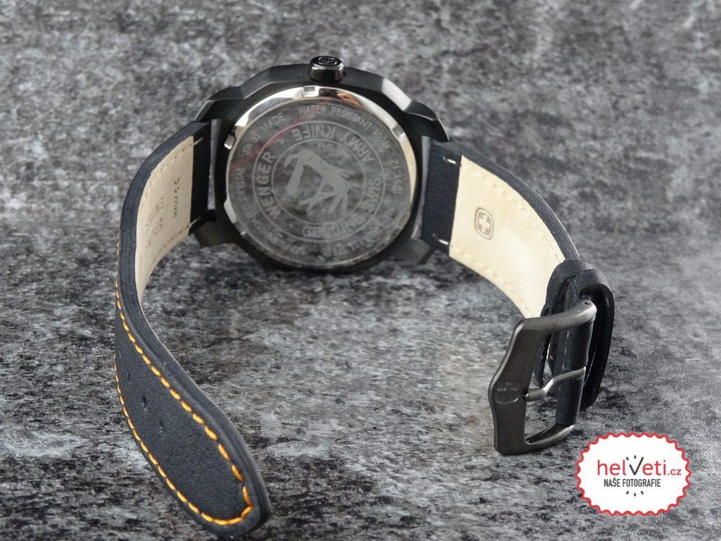 Modelová řada Escort přináší nové tvary a netradiční provedení. Na první pohled zaujme zkosené ocelové pouzdro, ze kterého vystupuje dominantní luneta upevněná čtyřmi viditelnými šroubky. Ta plynule přechází do minerálního sklíčka se safírovou úpravou, které chrání přehledný ciferník se třemi velkými indexy a malými vteřinovými indexy ve vnitřním ciferníčku. V horní části ciferníku je klasicky umístěn decentní znak Wenger a ve spodní části datumovka. Ručičky a body nad jednotlivými indexy jsou luminiscentní. Hodinky Wenger Escort 01.1051.107 vsadily na osvědčenou kombinaci černé a červené barvy. Oproti hodinkám 01.1051.103 mají navíc také černou PVD úpravu ocelového pouzdra. Velkou výhodou je pevný tlustý kožený řemínek.