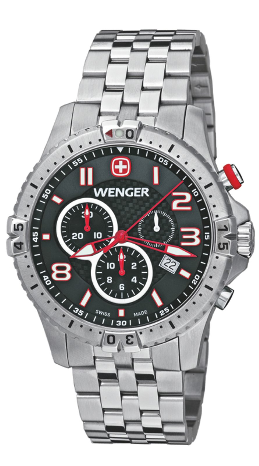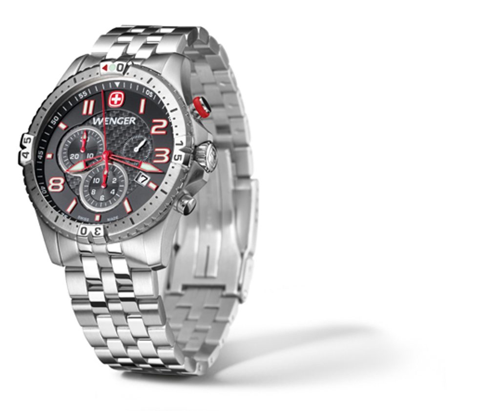 Pánské hodinky Wenger Squadron 77056 disponují safírovým sklíčkem, což znamená vyšší odolnost proti poškrábání. Jak už jsme u hodinek Wenger zvyklí, tak i tyto mají vodotěsnost 100m a vynikající luminiscenci. Mezi další funkce patří otočná luneta, chronograf a datumovka.