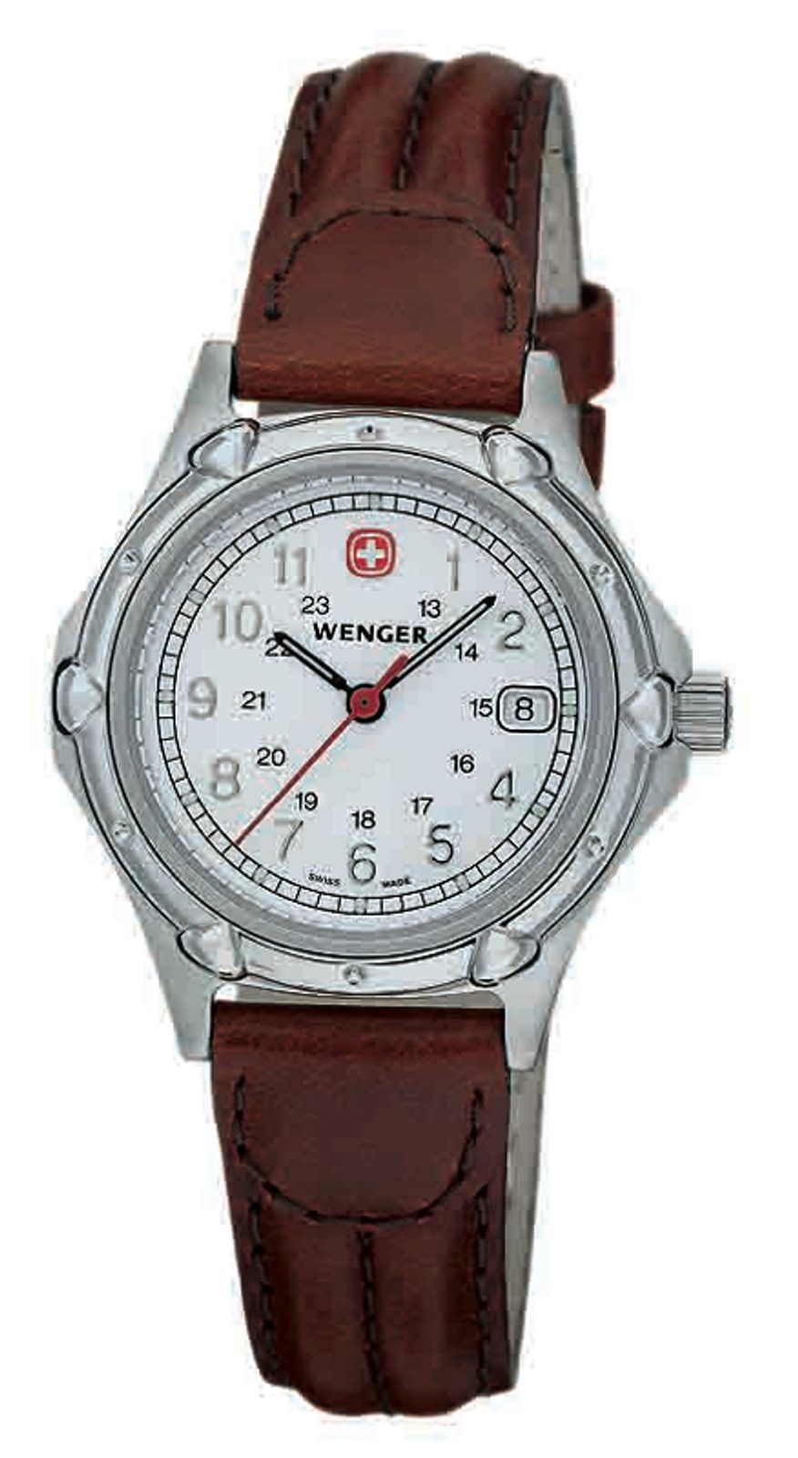 Dámské náramkové hodinky Wenger Standard Issue 70200 v klasickém stylu s ukazatelem 24 hodinového režimu a ukazatelem data na číselníku. Ocelové pouzdro se zdobným prstencem doprovází hnědý kožený řemínek.