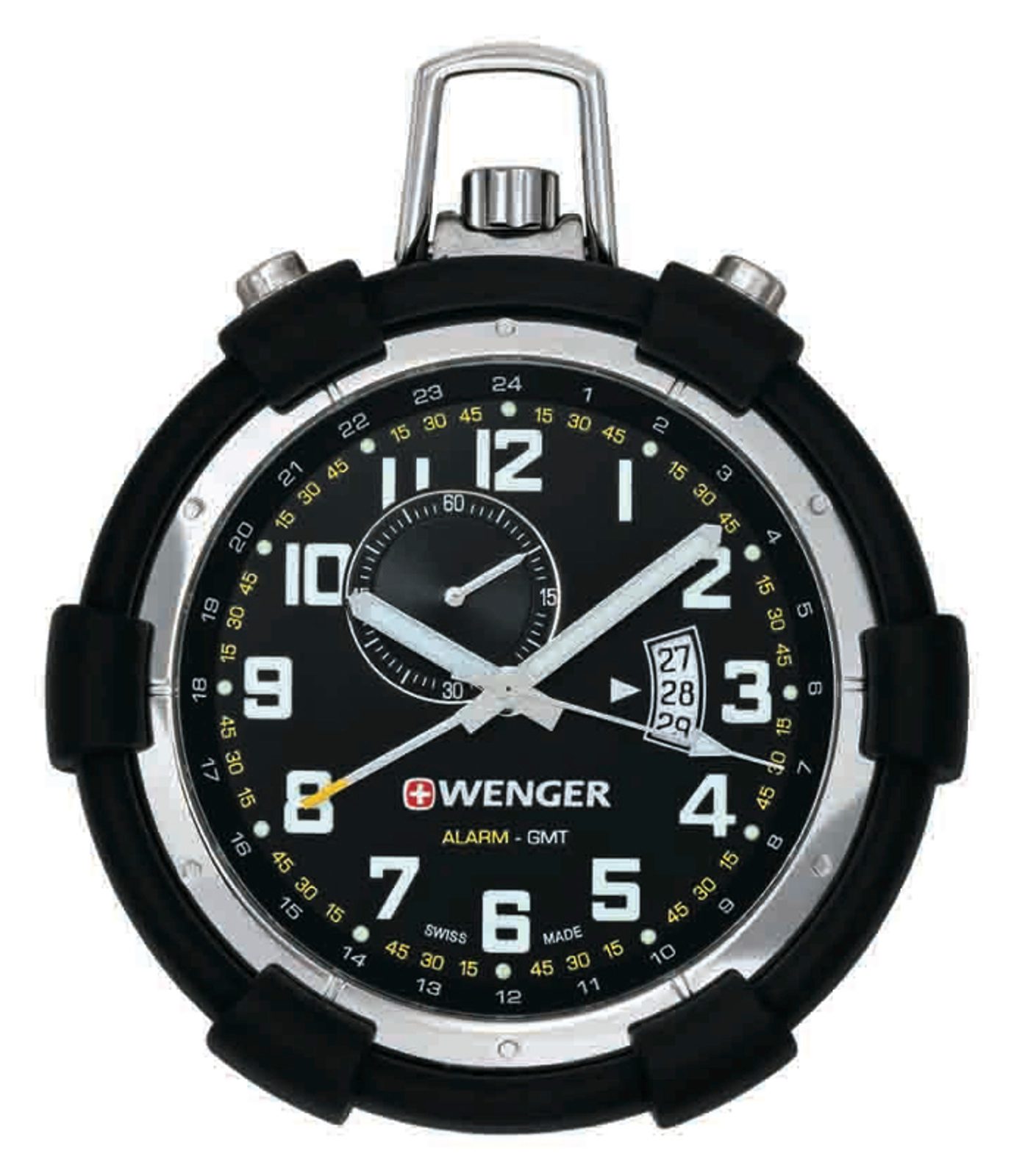 Originální kapesní hodinky. Mají minerální sklíčko se safírovou vrstvou, pod nímž se nachází černý číselník. Rozeznávají 2 časová pásma a mají alarm. Jsou vodotěsné do 30 M.