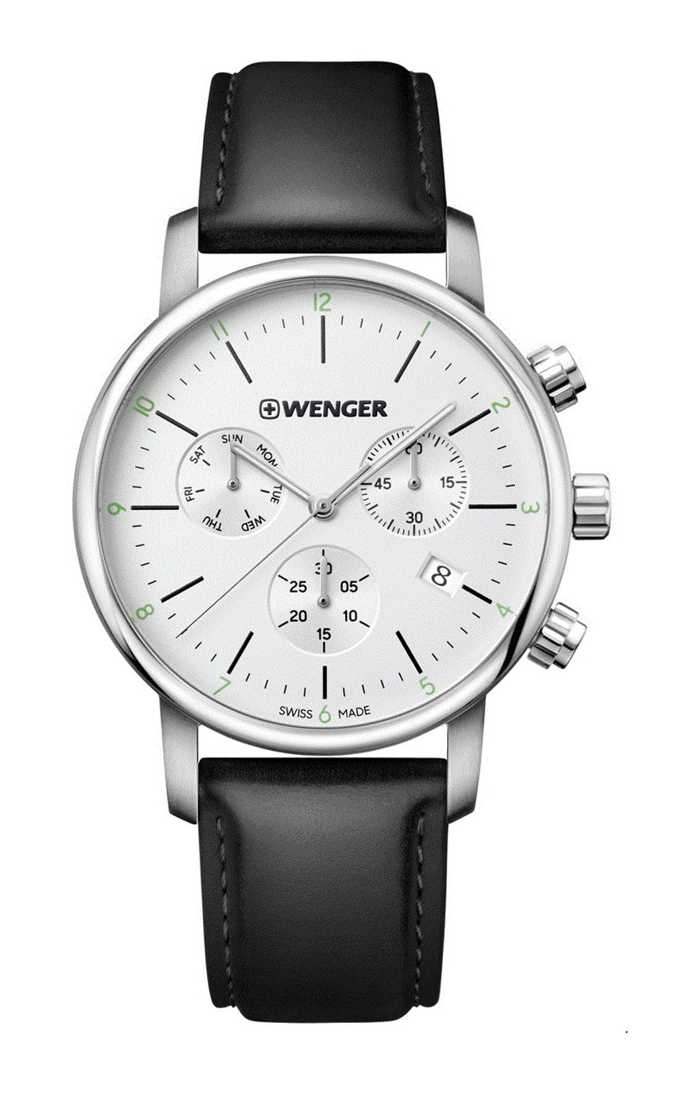 Společensky laděné hodinky Wenger Urban Classic Chrono 01.1743.118 mají přehledný ciferník, který obsahuje ukazatel data, dne v týdnu a stopky. Hodinky z řady Wenger Urban Classic mají voděodolnost 100m a minerální sklíčko se safírovou úpravou. Pouzdro hodinek je vyrobeno z oceli, řemínek je kožený. Hodinky mají švýcarský strojek Ronda Z60, který pohání baterie.