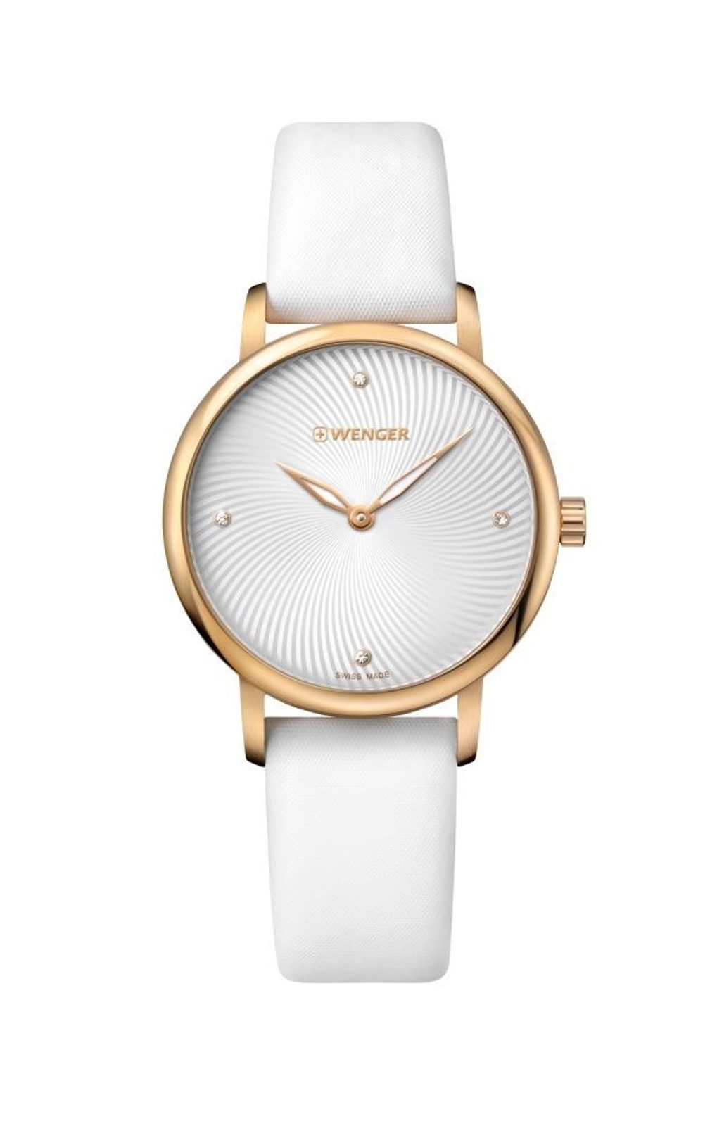 Dámské náramkové hodinky z nově představené modelové Urban Donnissima. Hodinky Wenger Urban Donnissima 01.1721.101 se hodí na každodenní nošení ale i do společnosti. Ciferník Vás na první pohled zaujme plastickým zpracováním. Hodinky disponují ocelovým pouzdrem zlaceným pomocí PVD úpravy a luminiscenčními ručičkami. Vodotěsnost tohoto modelu je 100m. V této cenové kategorii oceníte minerální sklíčko potažené safírovou vrstvou. Řemínek ve sněhově bílé barvě skvěle padne k bílému ciferníku, na kterém se nacházejí 4 Swarovski krystaly.