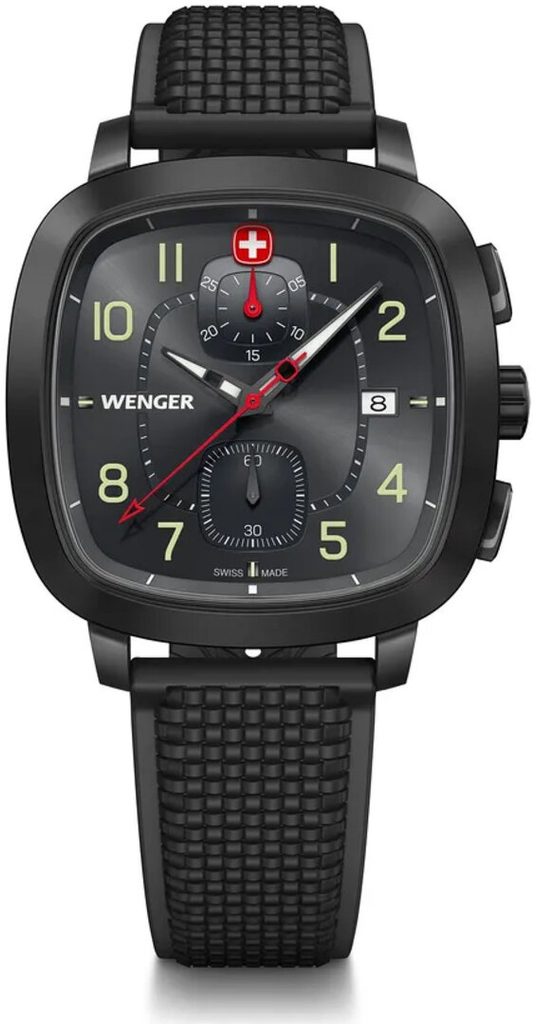 Nově představená modelová řada Vintage Sport přináší inovativní pouzdro v hranatém tvaru s černou PVD úpravou, který využívá stejný tvar jako samotné logo Wengeru. Představuje klasický ciferník s nazelenalými indexy, a okénkem pro datum na 3. hodině.